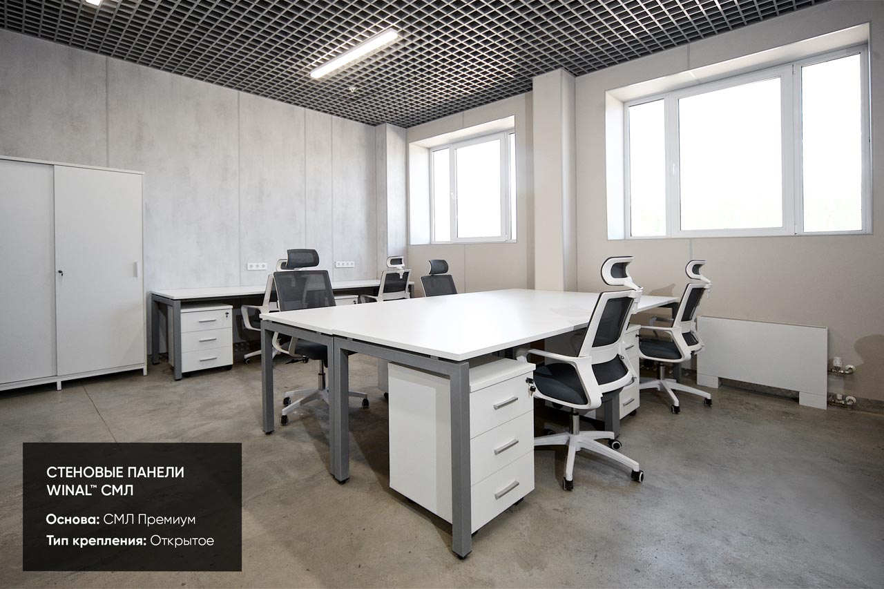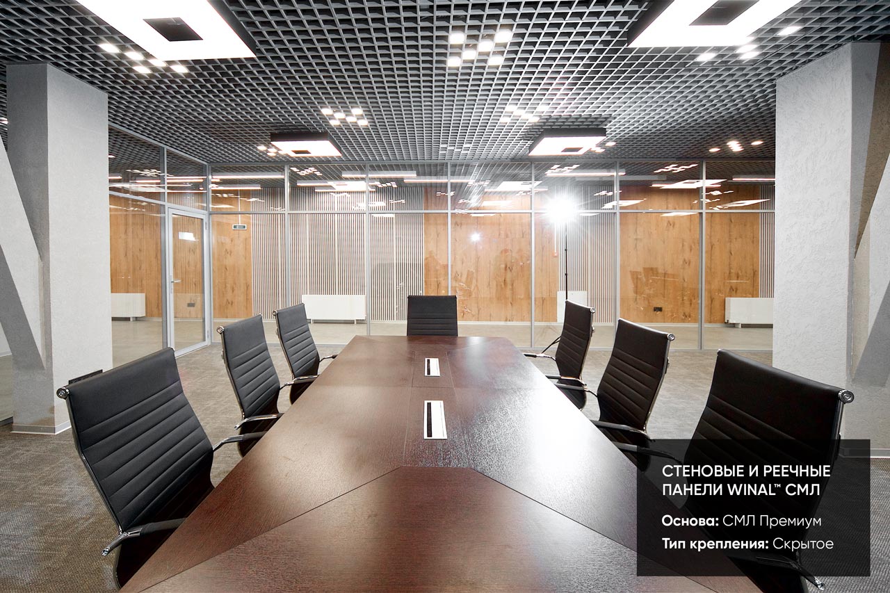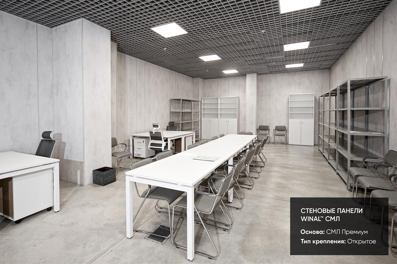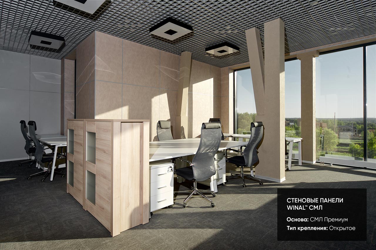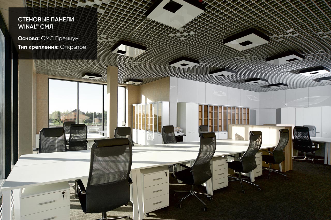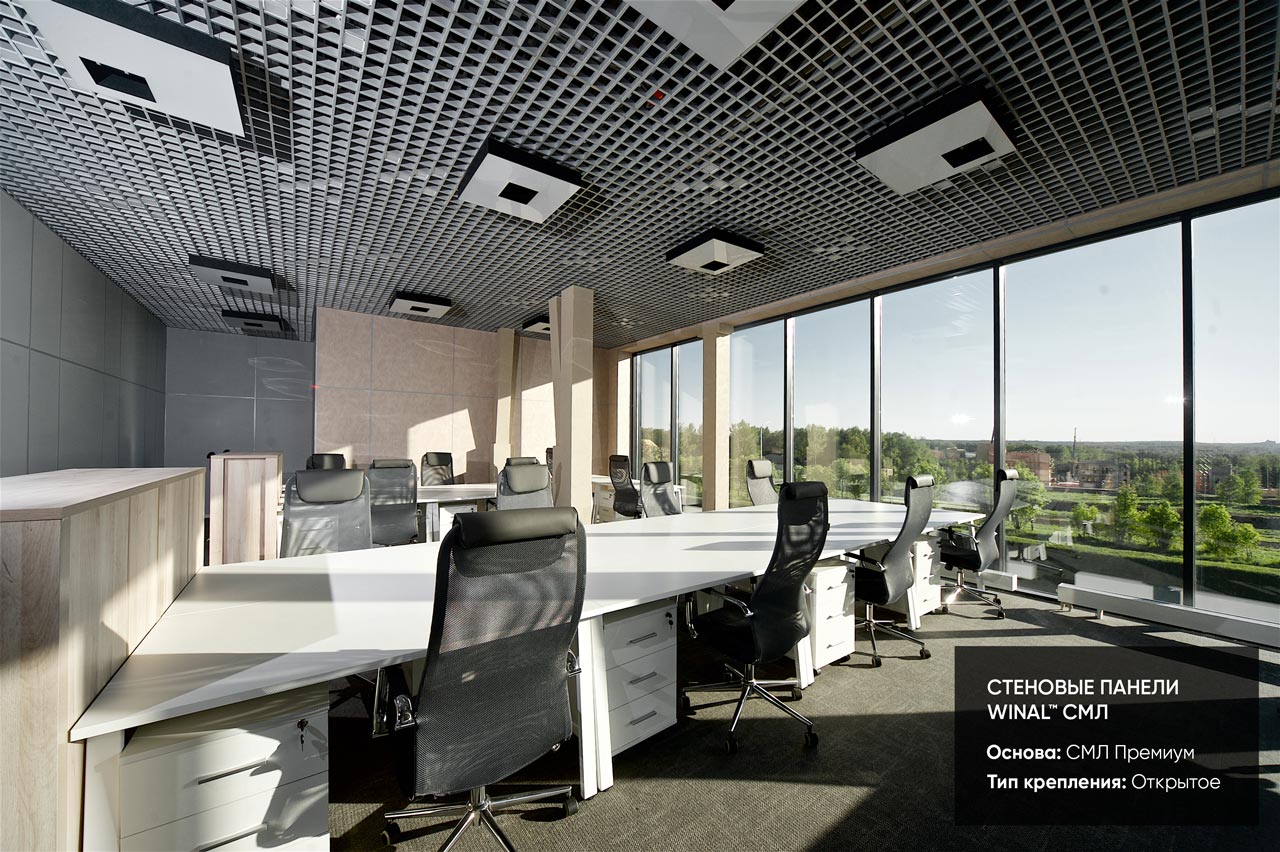 Отделка стен, потолков и перегородок в офисах декоративными панелями HPL, окрашенными или ламинированными ПВХ пленкой.