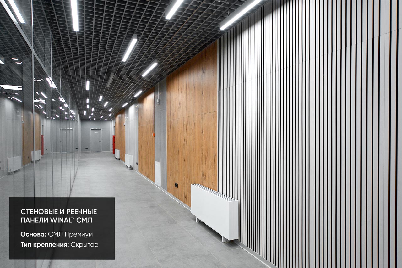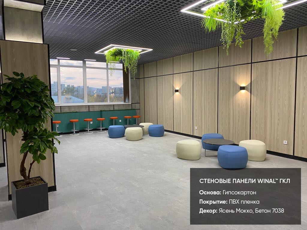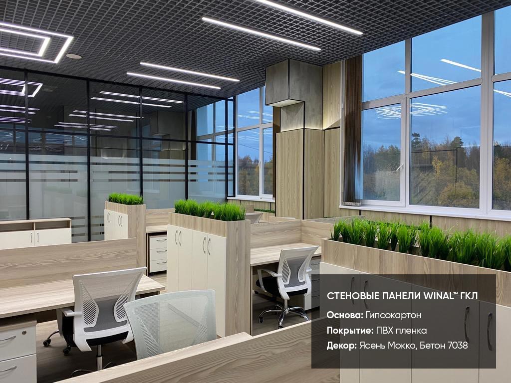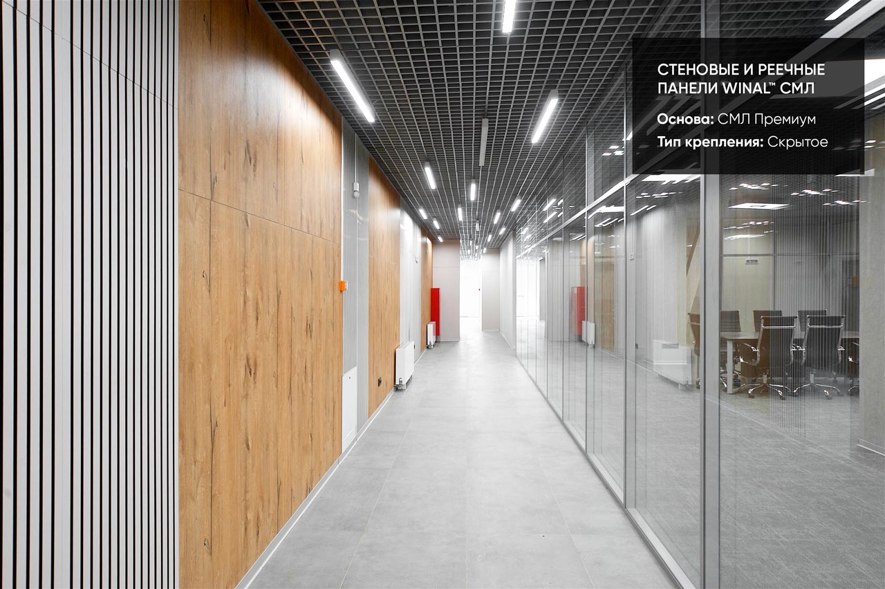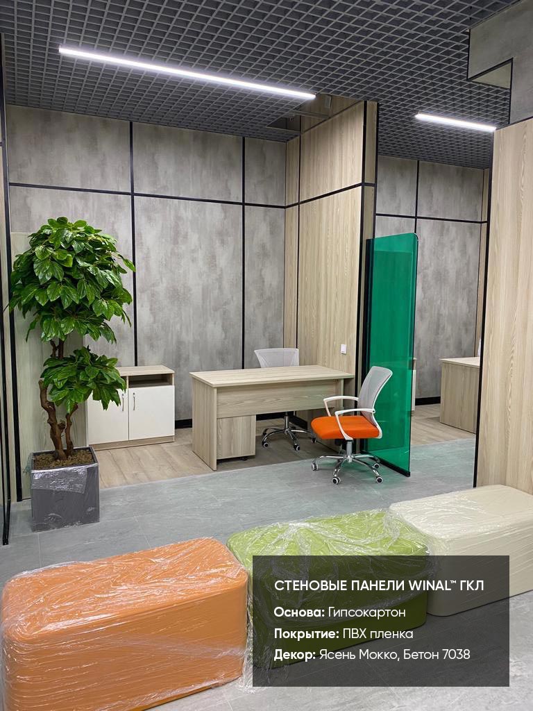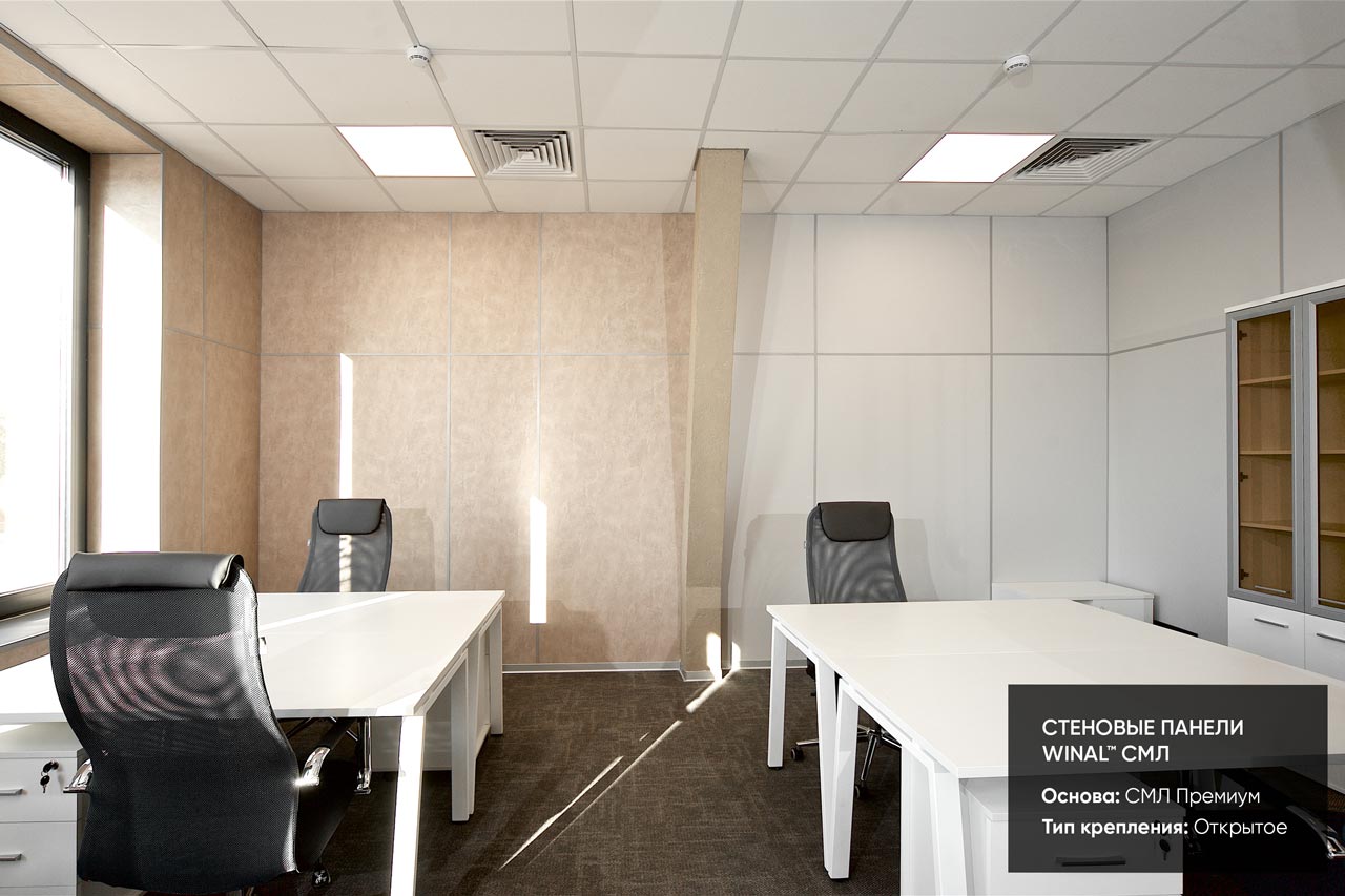 Отделка стен, потолков и перегородок в офисах декоративными панелями HPL, окрашенными или ламинированными ПВХ пленкой.