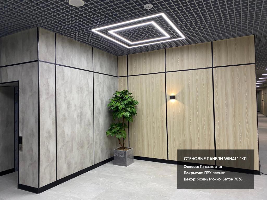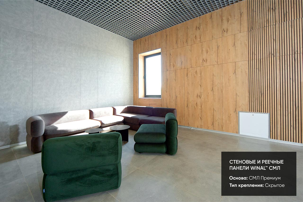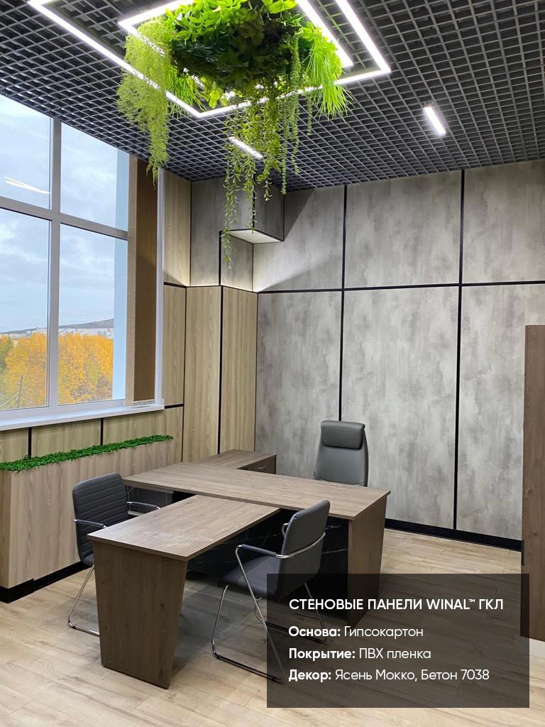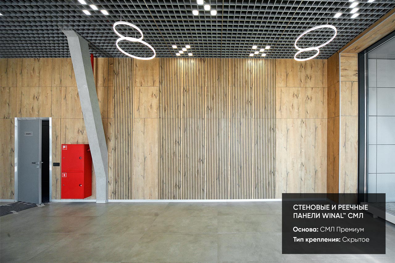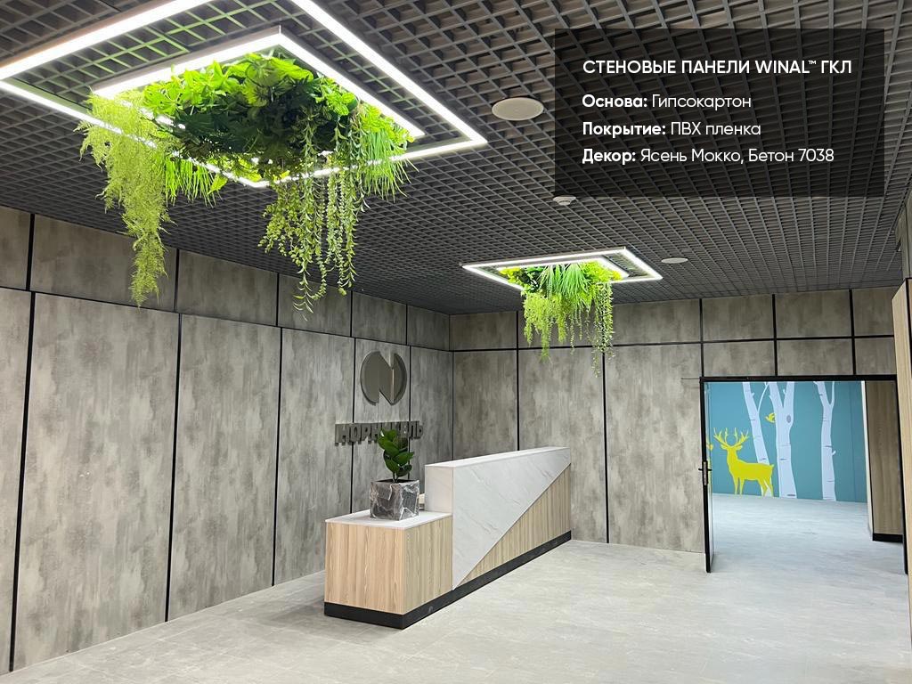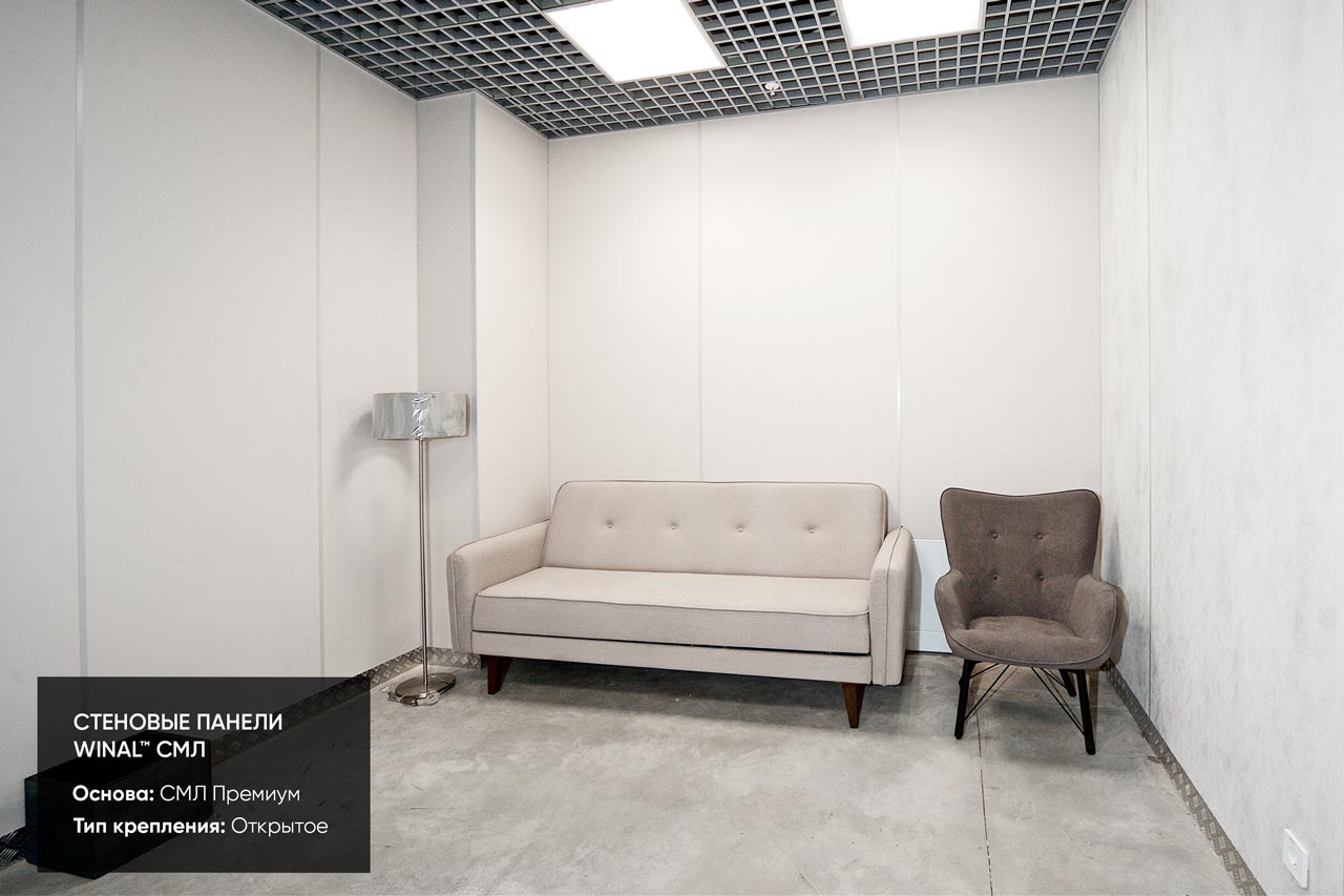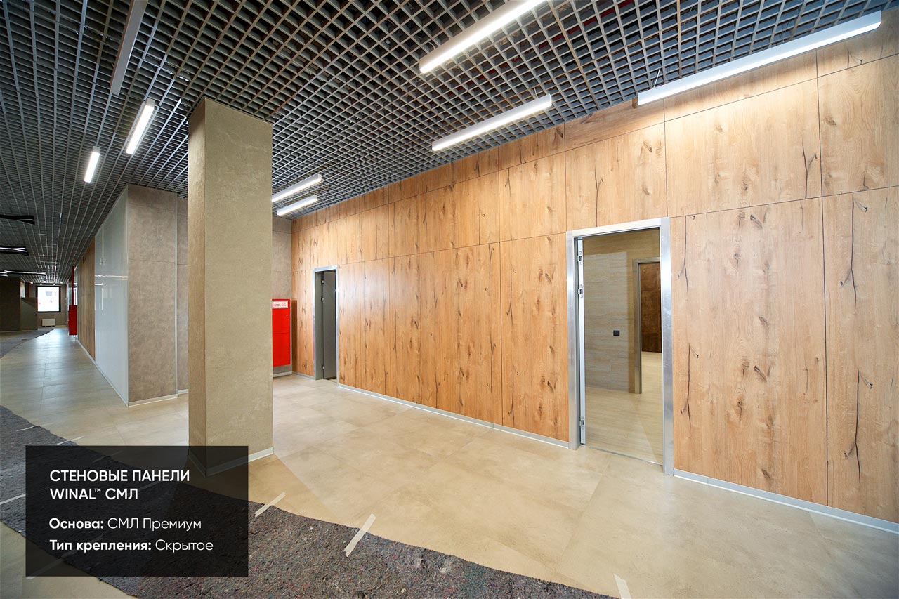 Отделка стен, потолков и перегородок в офисах декоративными панелями HPL, окрашенными или ламинированными ПВХ пленкой.