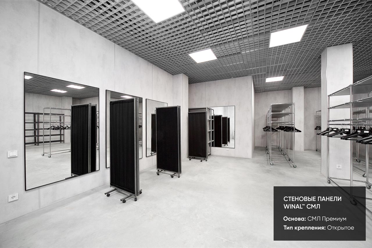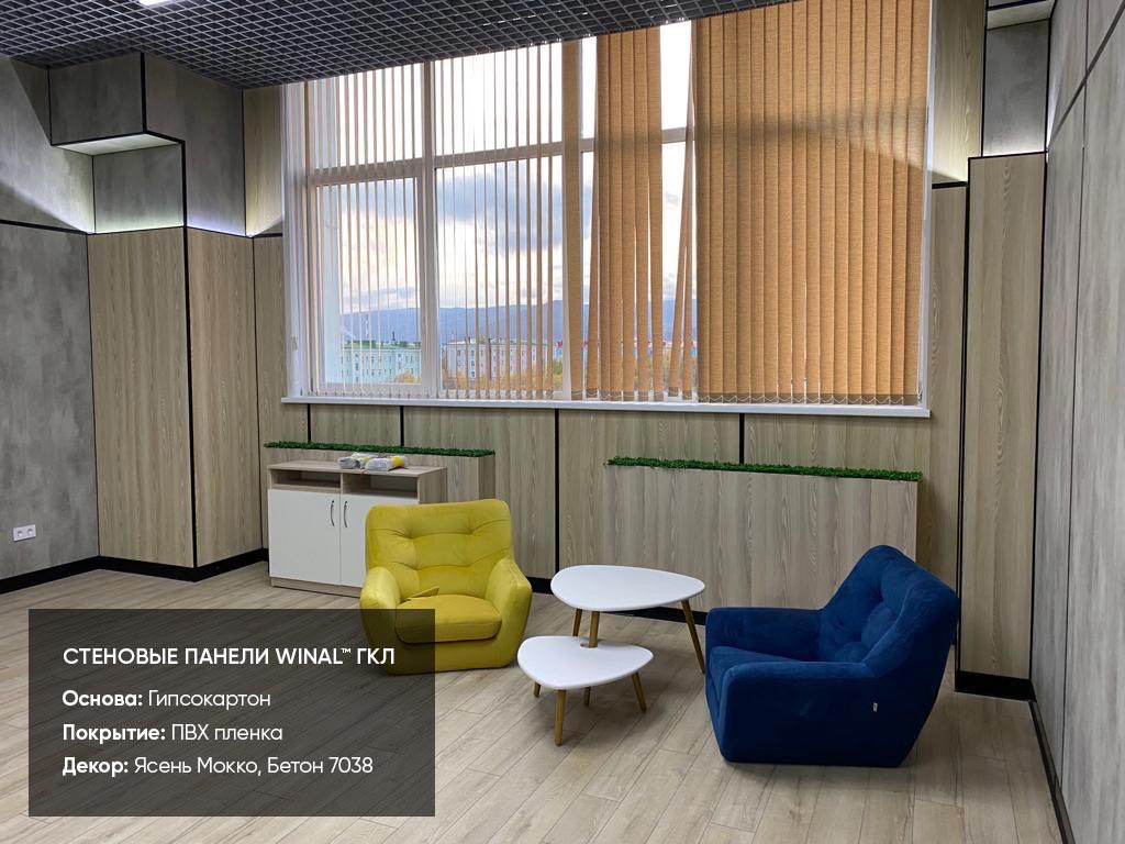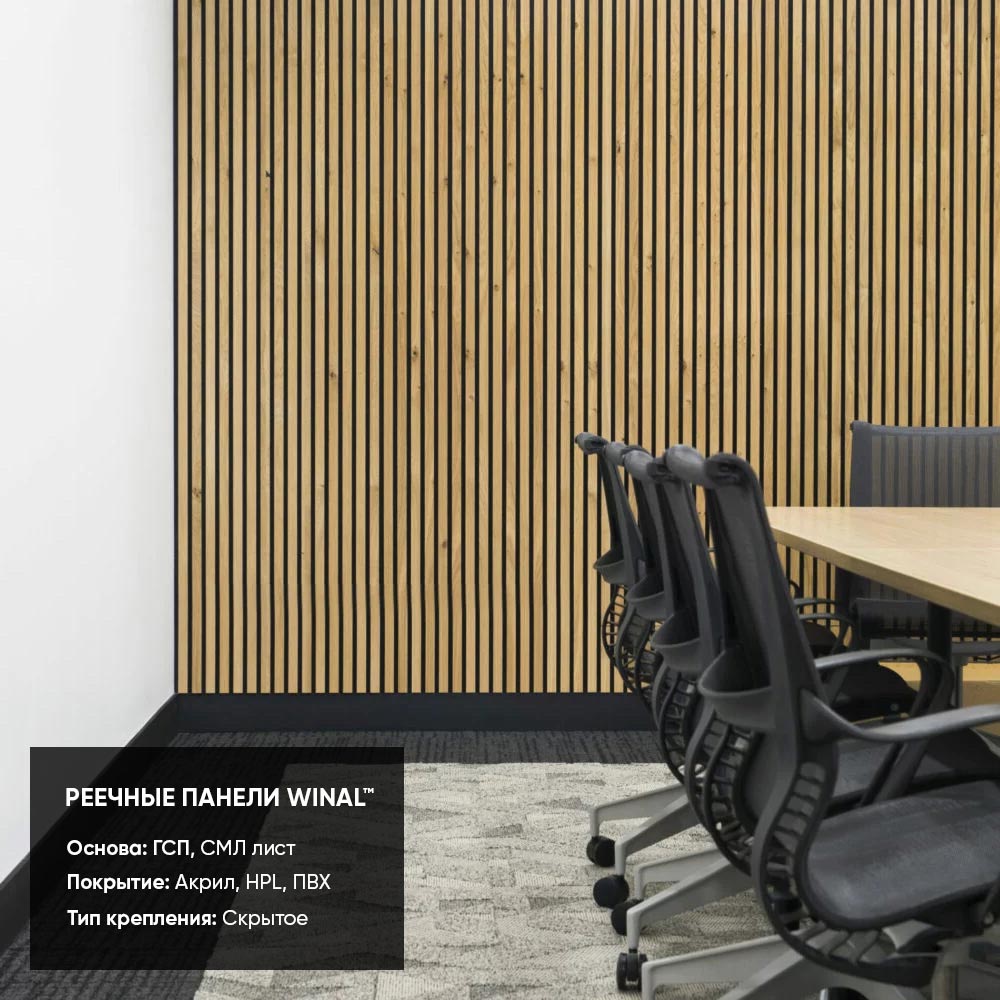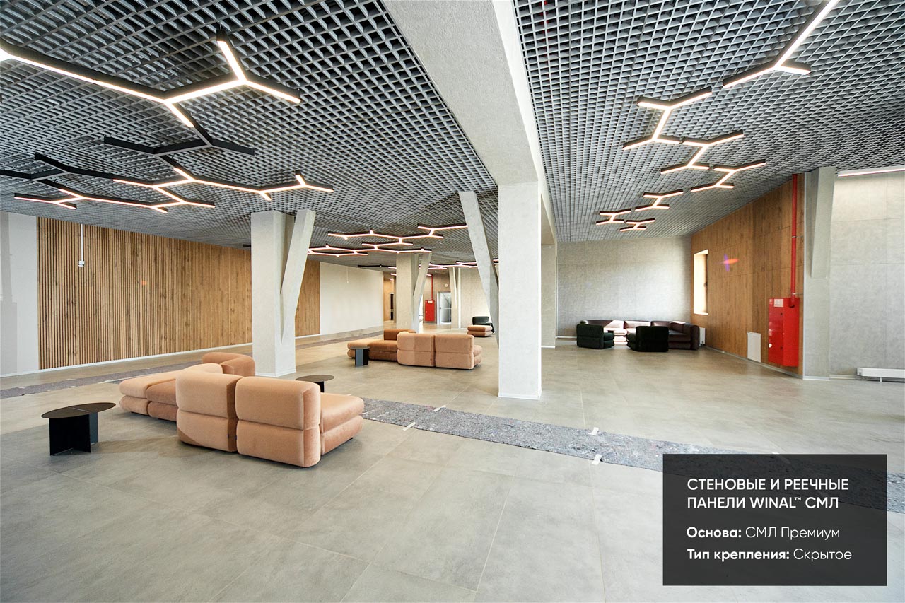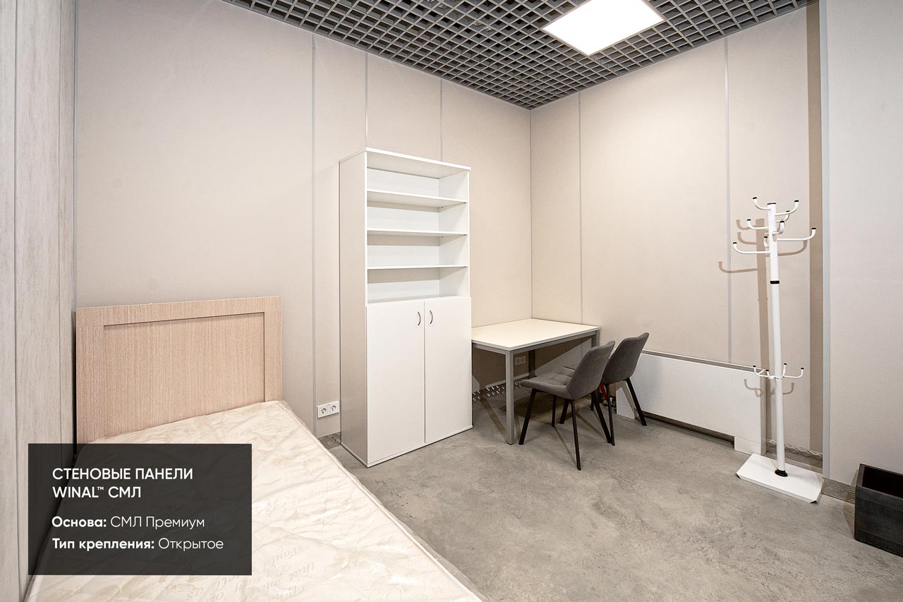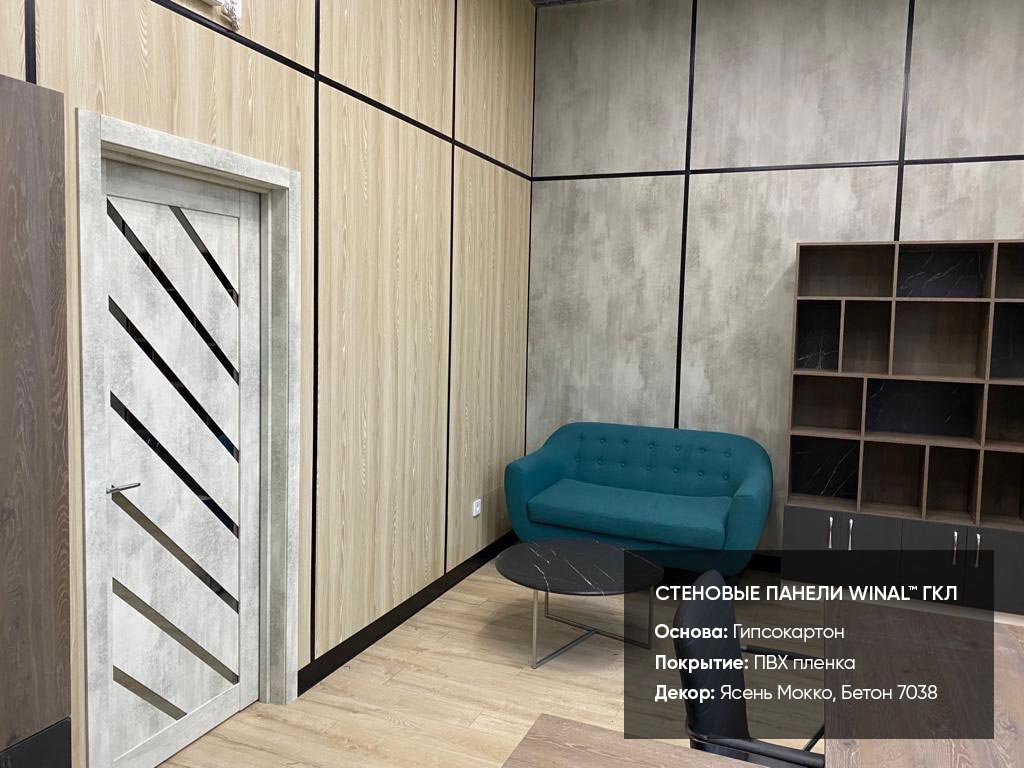 Отделка стен, потолков и перегородок в офисах декоративными панелями HPL, окрашенными или ламинированными ПВХ пленкой.