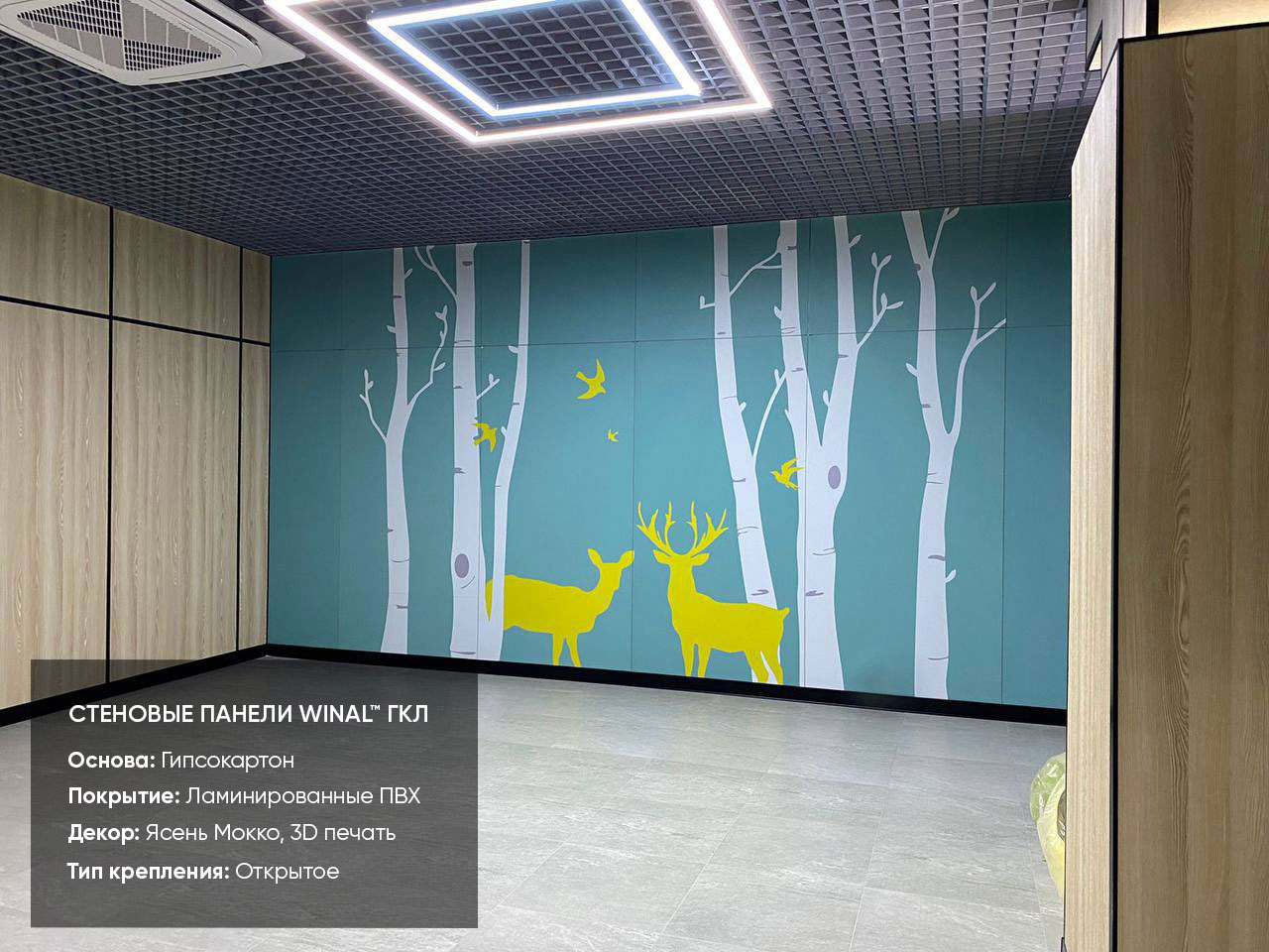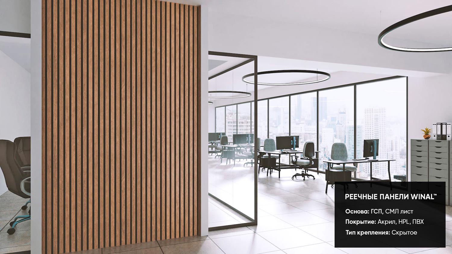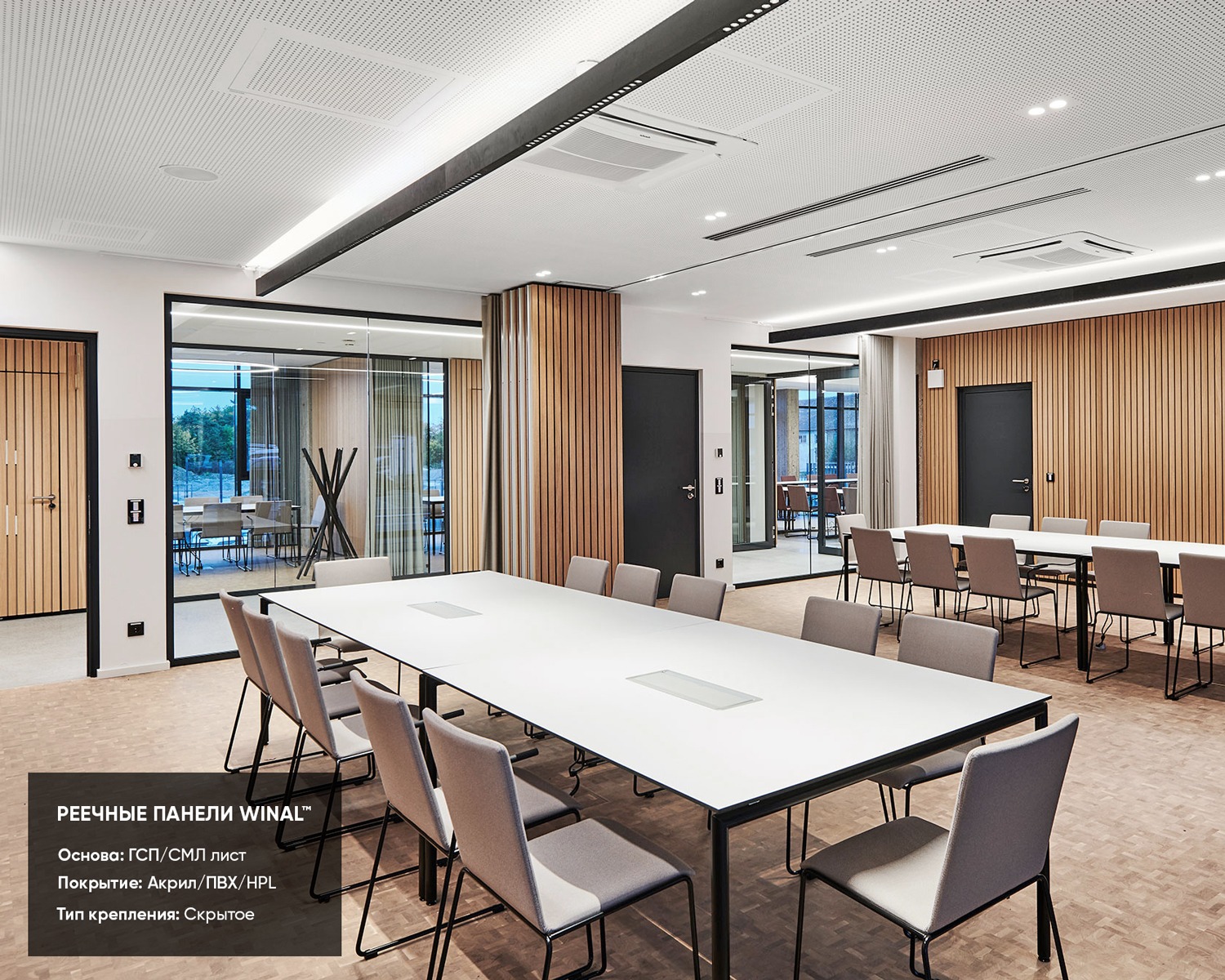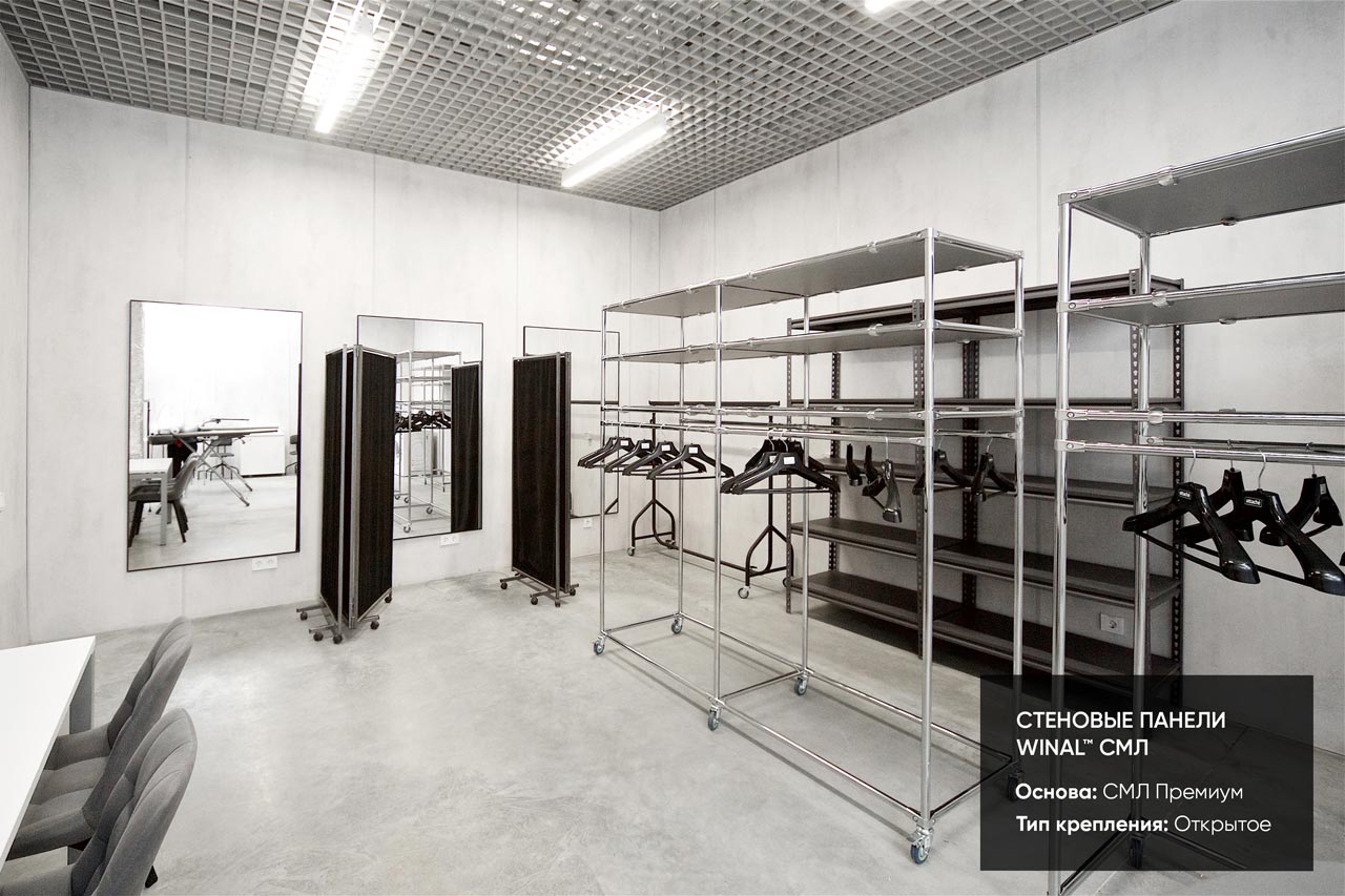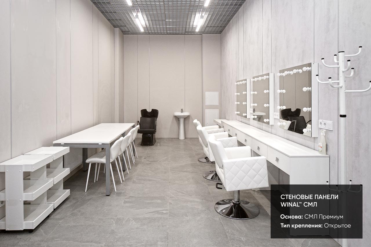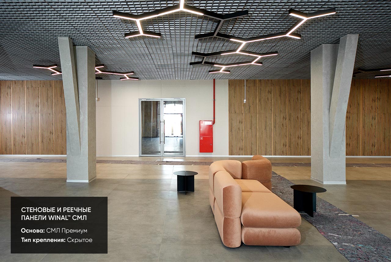 Отделка стен, потолков и перегородок в офисах декоративными панелями HPL, окрашенными или ламинированными ПВХ пленкой.