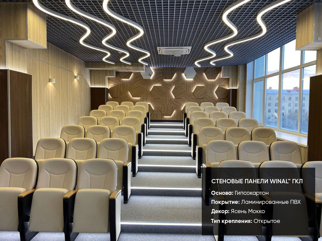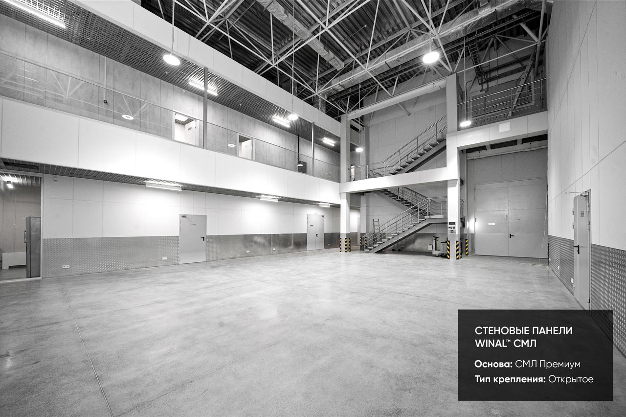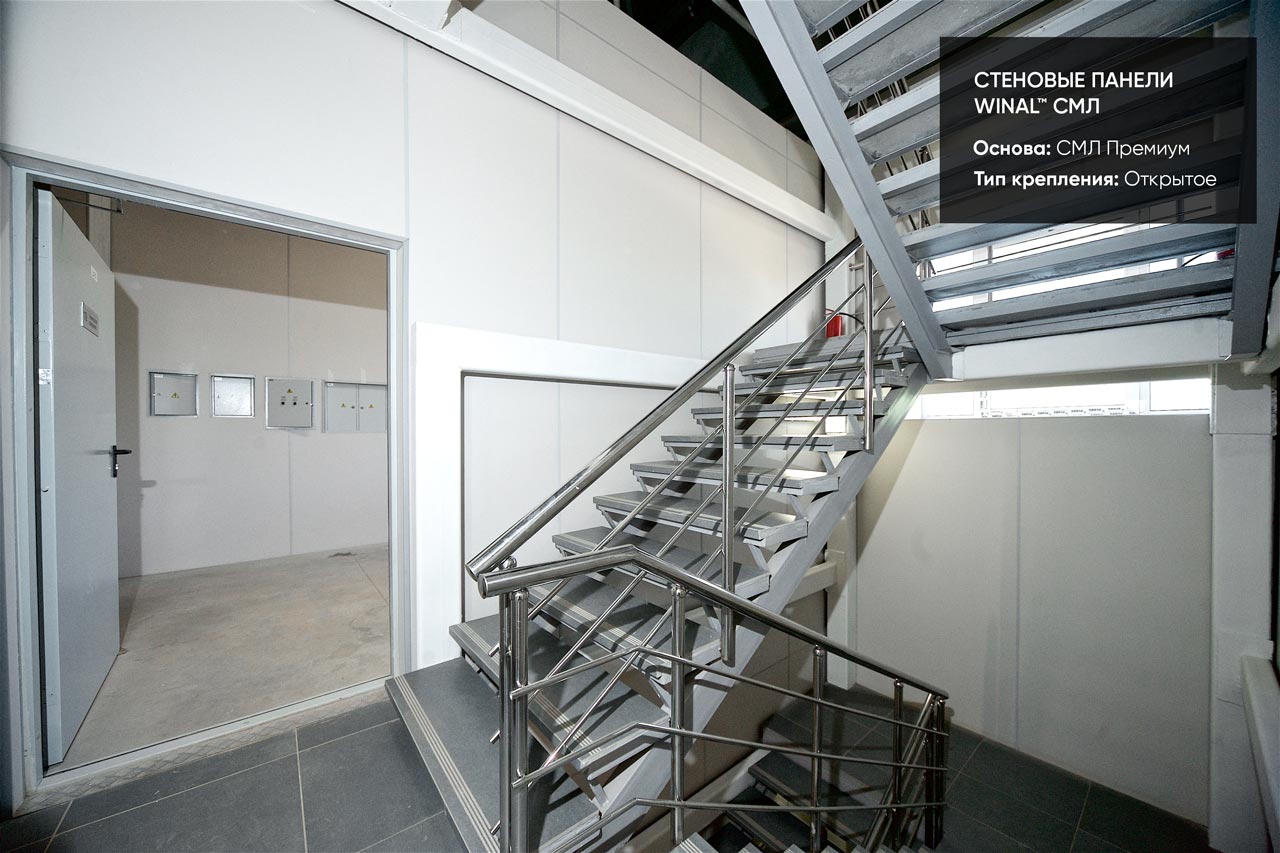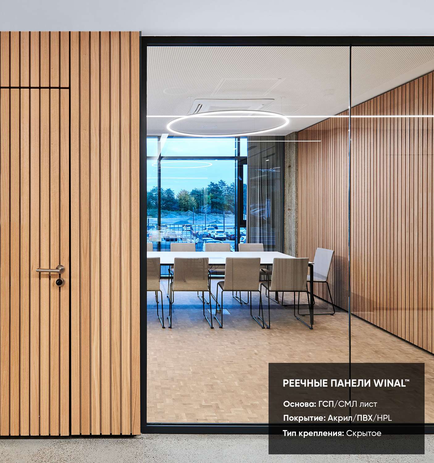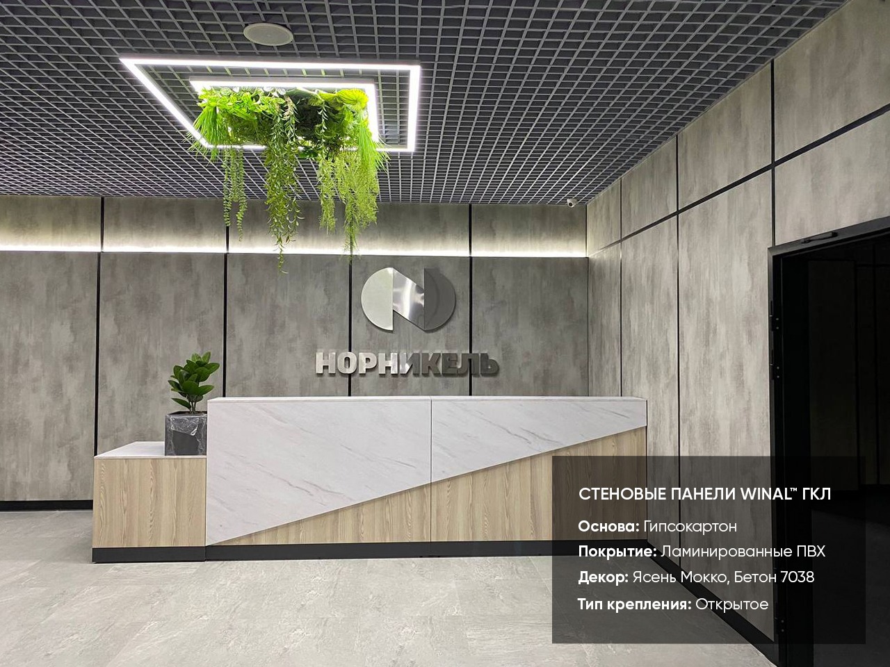 Отделка стен, потолков и перегородок в офисах декоративными панелями HPL, окрашенными или ламинированными ПВХ пленкой.